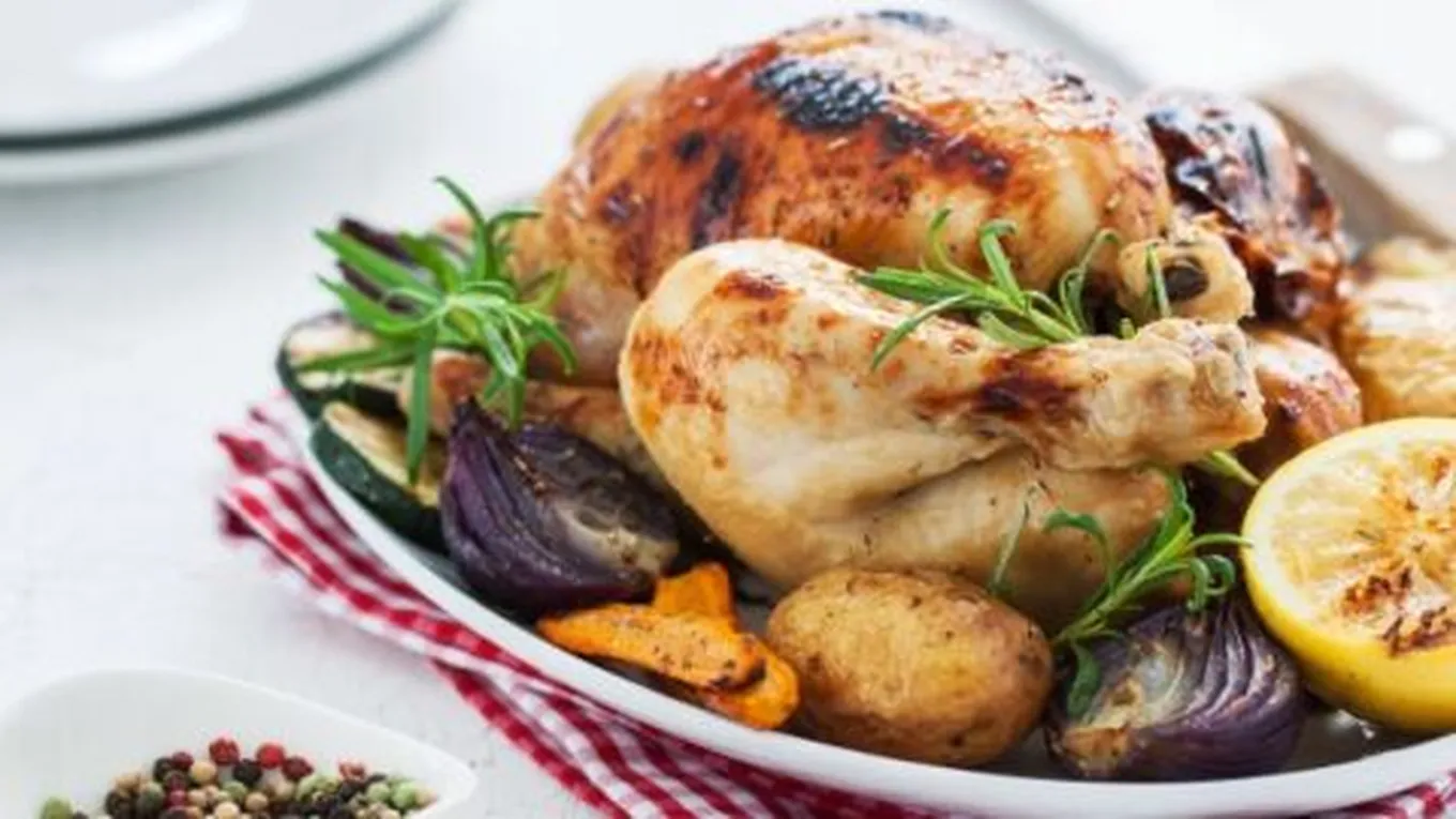 - أخرجي الديك الرومي من الثلاجة في اليوم التالي، ثمّ وزّعي الخضار المشكلة عليه، ثمّ غلّفي الصينية بورق القصدير.