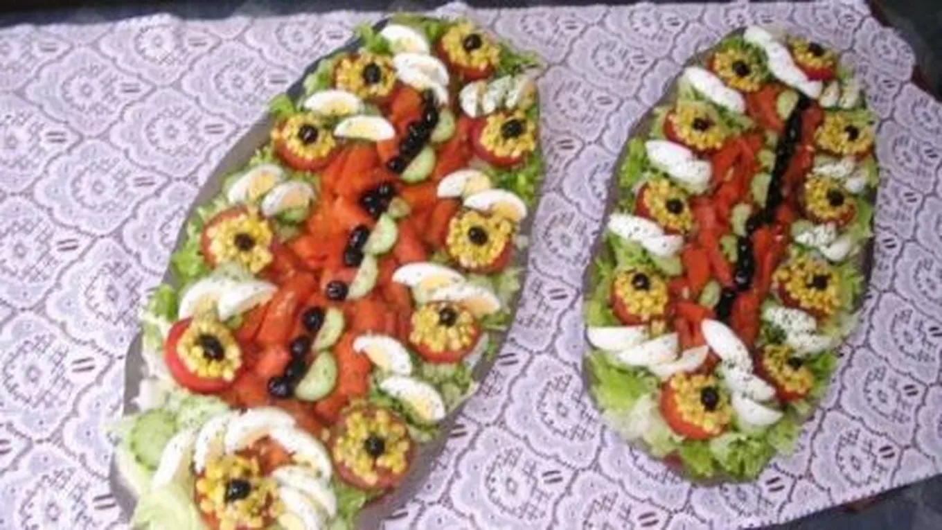- نضع شرائح من الطماطم حول الطبق، وحولها مكعبات البطاطا المقلية، والذرة المسلوقة، وشروحات البيض المسلوق، والقليل من البقدونس، والكزبرة المفرومين كتزيين لطبق السلطة، وتقدم.