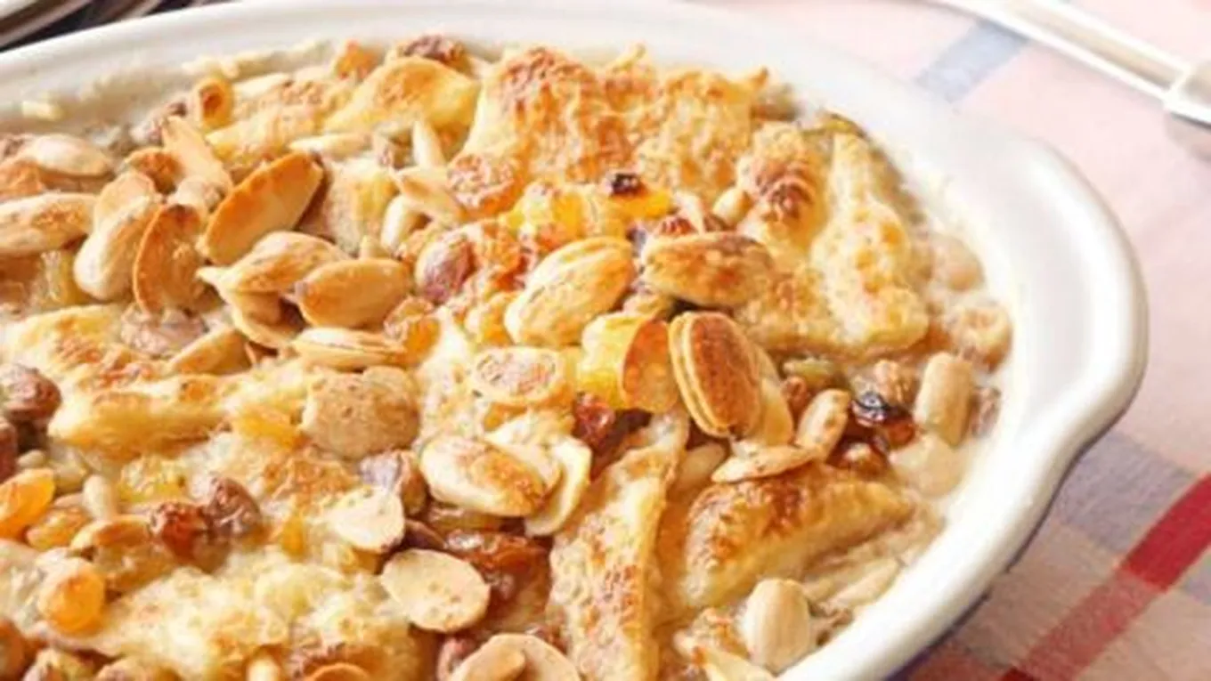 - نضع الباف باستيري، والمكسّرات في صينية للفرن، ثم نضيف الحليب السائل، وبعدها ندخل الصينية إلى فرن متوسّط الحرارة لمدة عشرين دقيقة.