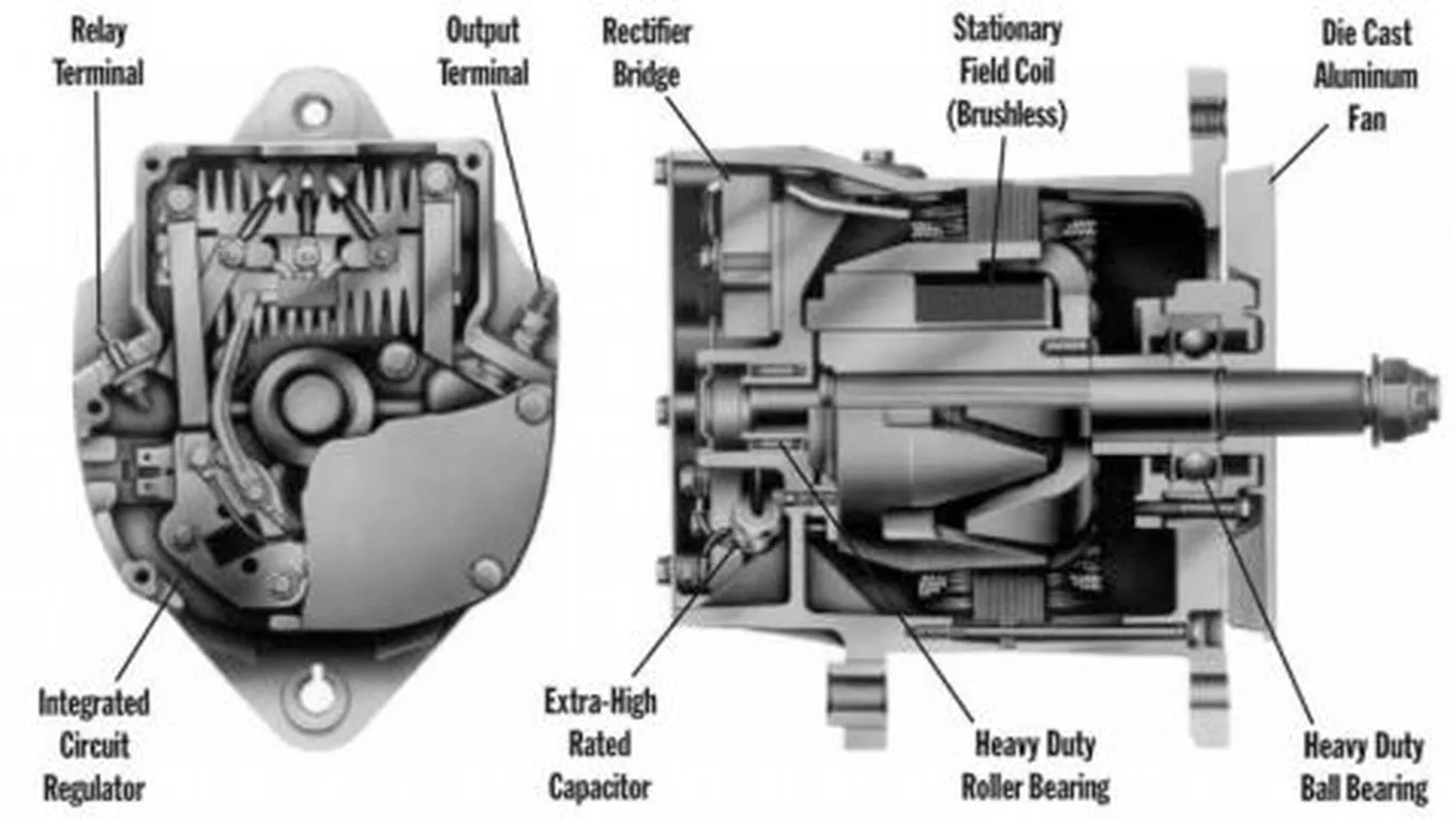 - حقل مغناطيسي: وظيفته استقبال الحركة الدائريّة، ثم تحويلها إلى تيّار مستمر، معتمداً على مبدأ فارادي، لأنّ بطارية السيارة تعمل بالتيار المستمر، وتحتاج لشحنها بهذا التيّار بشكل دائم.