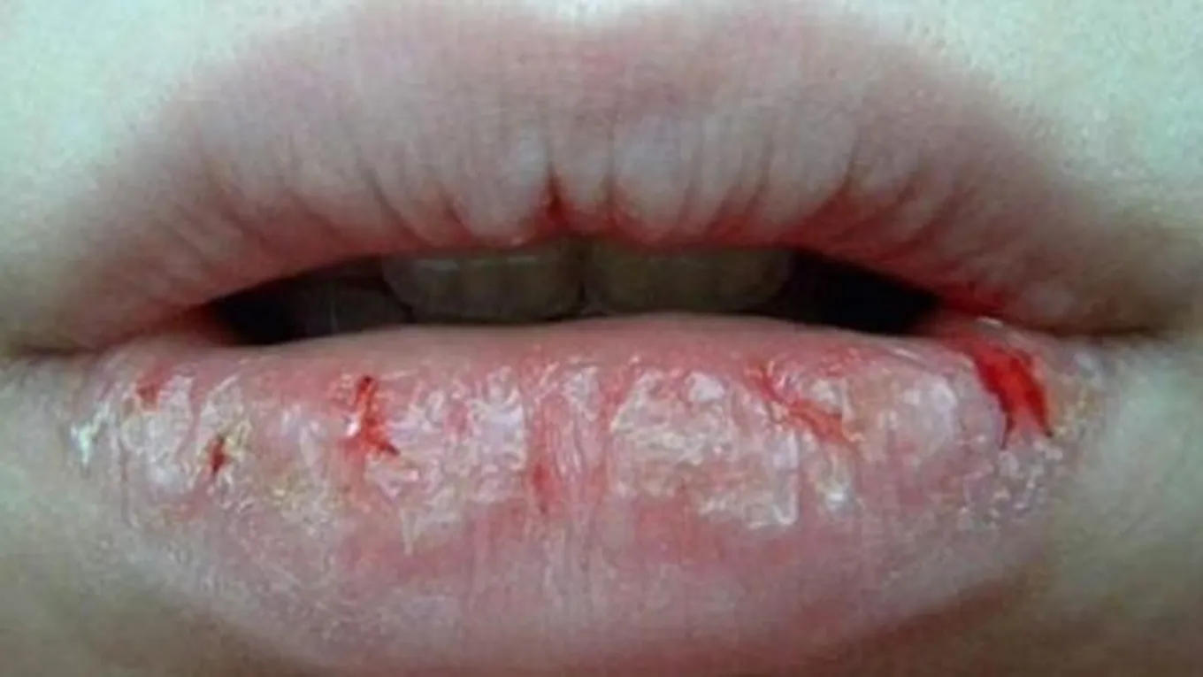 - الجفاف التام للجلدِ الموجود على سطح الشفاه، وظهور تشققاتٍ فيه ممّا يُؤدي إلى تساقطه.