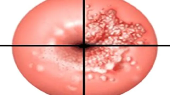 - القرحة البسيطة: التي يكون لونها أحمر بينما يكون لون الرحم الطبيعي أحمر خفيف مائل إلى الأرجواني حيث تظهر الإفرازات المخاطية أو المخاطية الصديدية خارجة من فتحة عنق الرحم.