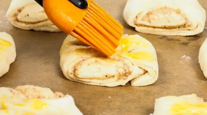 - ندهن المعجّنات بكميّة من الزبدة المذابة مع القليل من الحليب السائل، ويُفضّل أن يكون الحليب كامل الدسم.