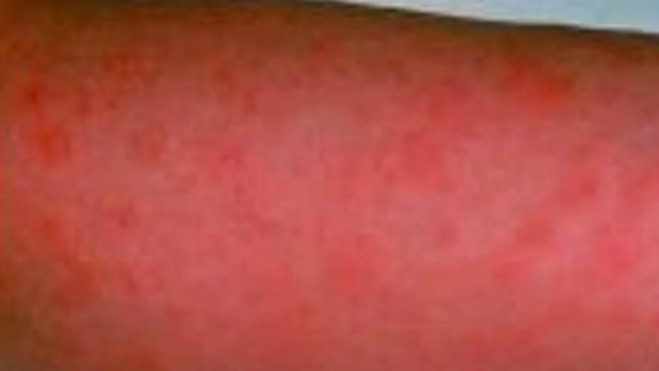 - الطفح الجلديّ (بالإنجليزية: Skin Rash)، وغالباً ما يظهر بعد 12-48 ساعة من ظهور الأعراض السابقة، ويمكن القول إنّ الطفح يبدو كحروق الشمس على الأذنين، والرقبة، والكوعَين، وباطن الأفخاذ وأصلها، وغيرها، وعلى الرغم من نُدرة تأثّر الوجه بهذا الطفح؛ إلا أنّ الوجنتَين قد تتأثّران عند بعض الأشخاص وقد تبدو المنطقة حول الفم شاحبةً. ومن الجدير بالذكر أنّ الطفح الجلديّ يختفي في الغالب بعد مرور ستة أيام.
