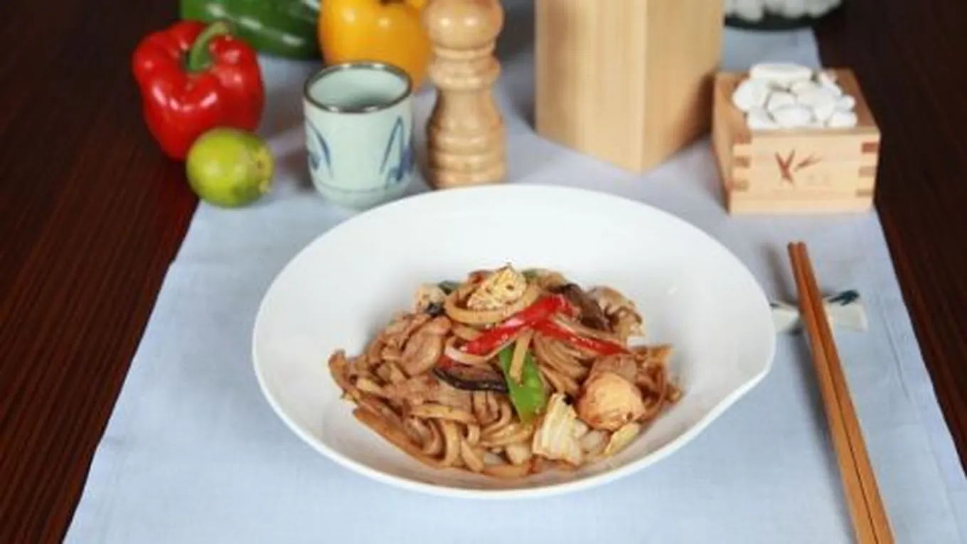 - نضيف النودلز المسلوقة للخليط ونخلط حتّى تتشبّع النودلز بالنكهات.