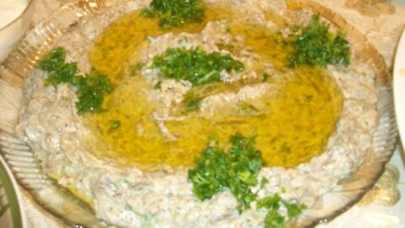 - إزالة الباذنجان من الفرن وتركه ليبرد، ثمّ إخراج اللب منه باستخدام ملعقة ووضعه في طبق عميق، وتقشير البصل أيضاً.